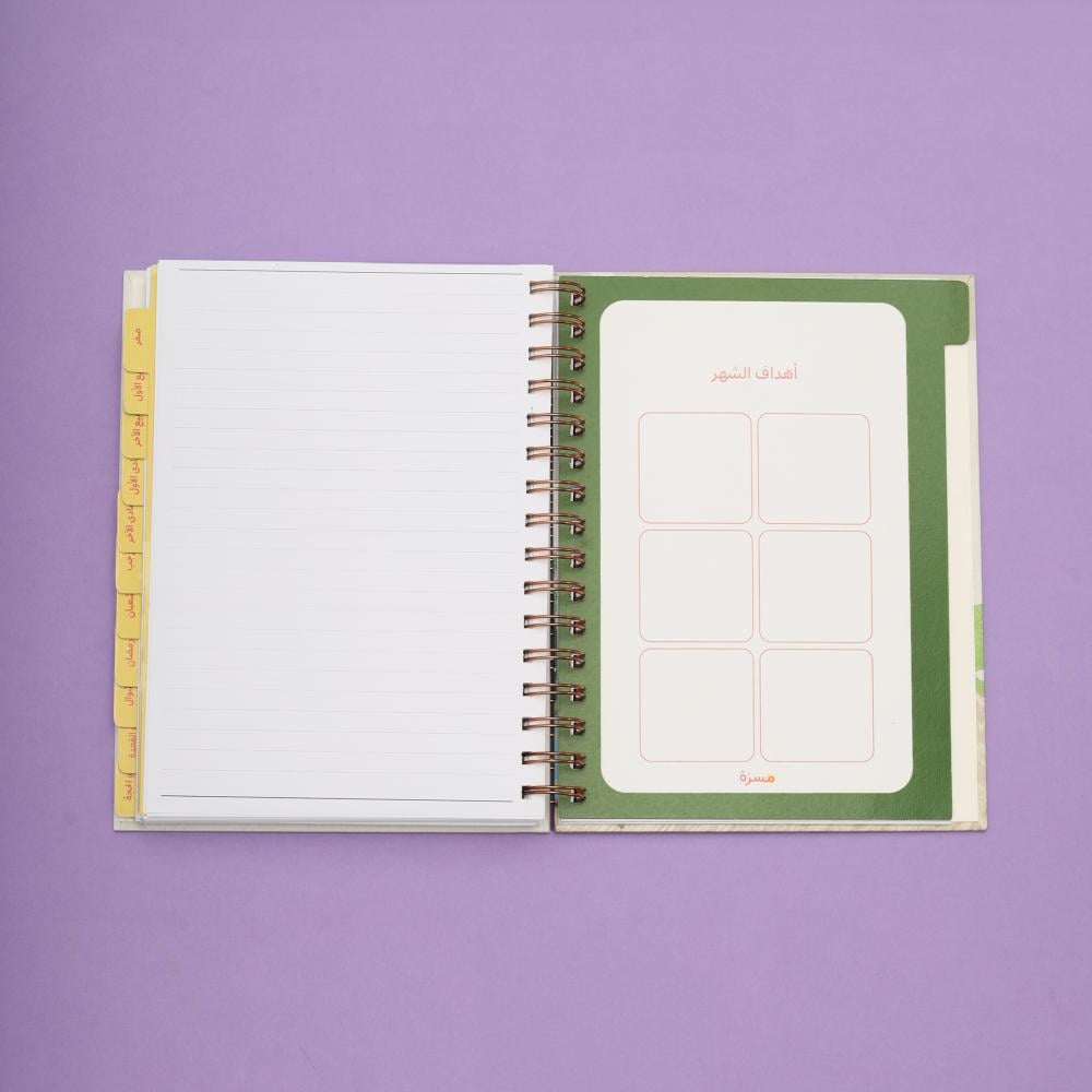 • فواصل شهرية مقصوصة ومحددة لسرعة الرجوع للشهر بعبارات مختلفة ملونة، مع مساحة مخصصة لتحديد أهداف الشهر، لإضافة لمسة مميزة لكل شهر.