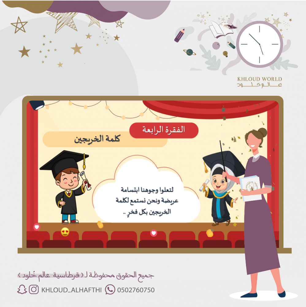 - مكون من 20 شريحة منوعة بفقرات الحفل وأناشيد للتخرج وشهادات يمكنكم تكرارها على عدد الطالبات