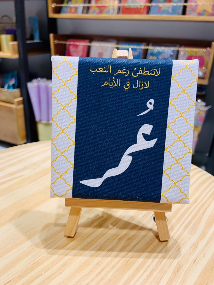 حيث يتوسطها ورقة بلون متباين من الأخضر الملكي تحوي كلمة " عمر " وبتشكيل وخط مميز يبرز جمال اللوحة ..